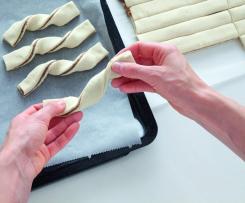 , od jedné strany k druhé a poté je přeřízněte na třetiny, abyste vytvořili 24 proužků (zhruba 3x14 cm). - Nechte závitky vychladnout a poté je posypte moučkovým cukrem.